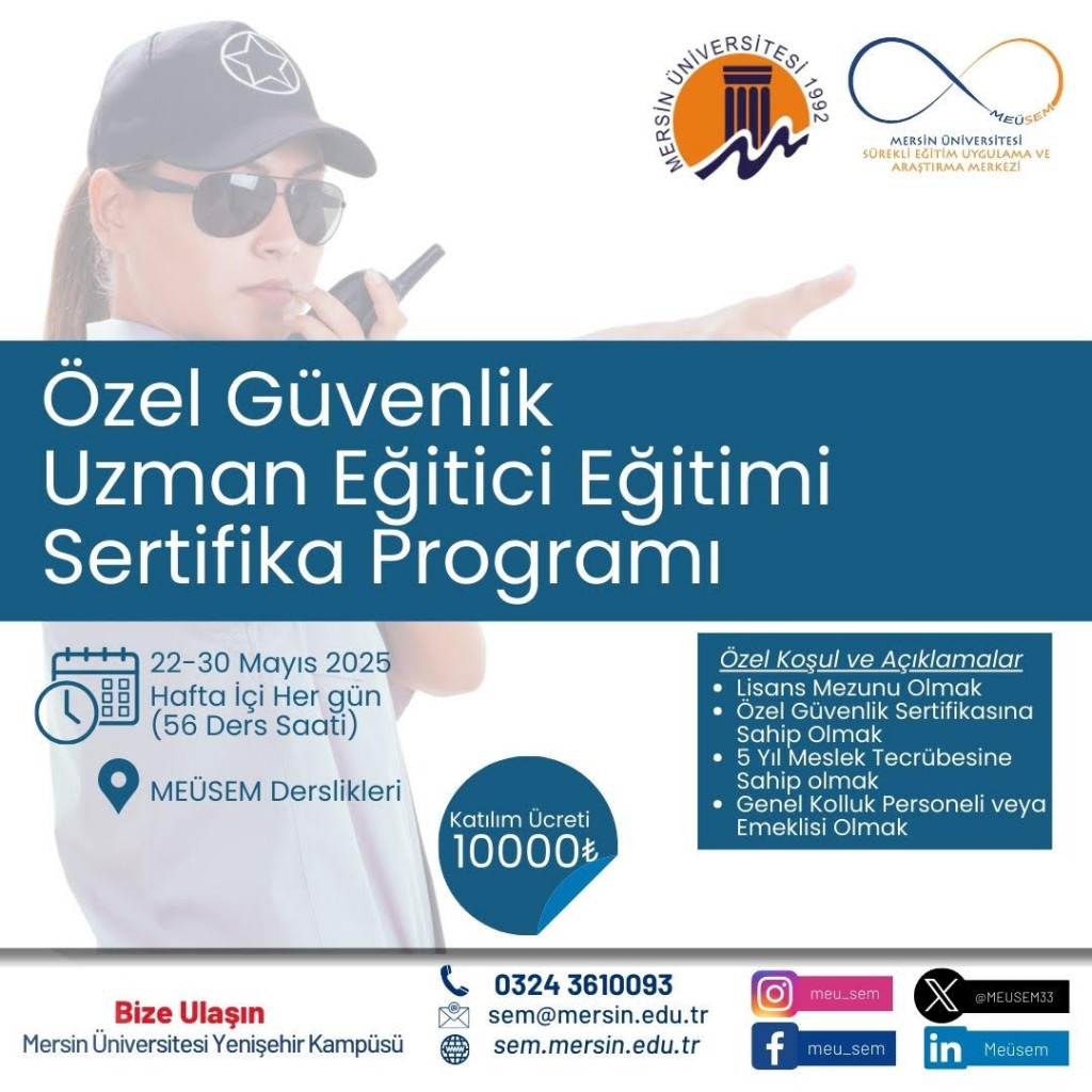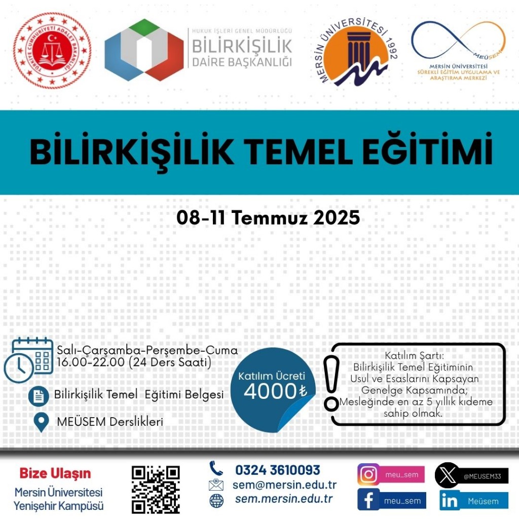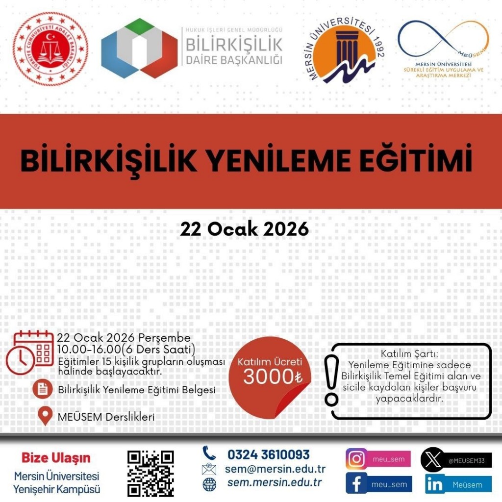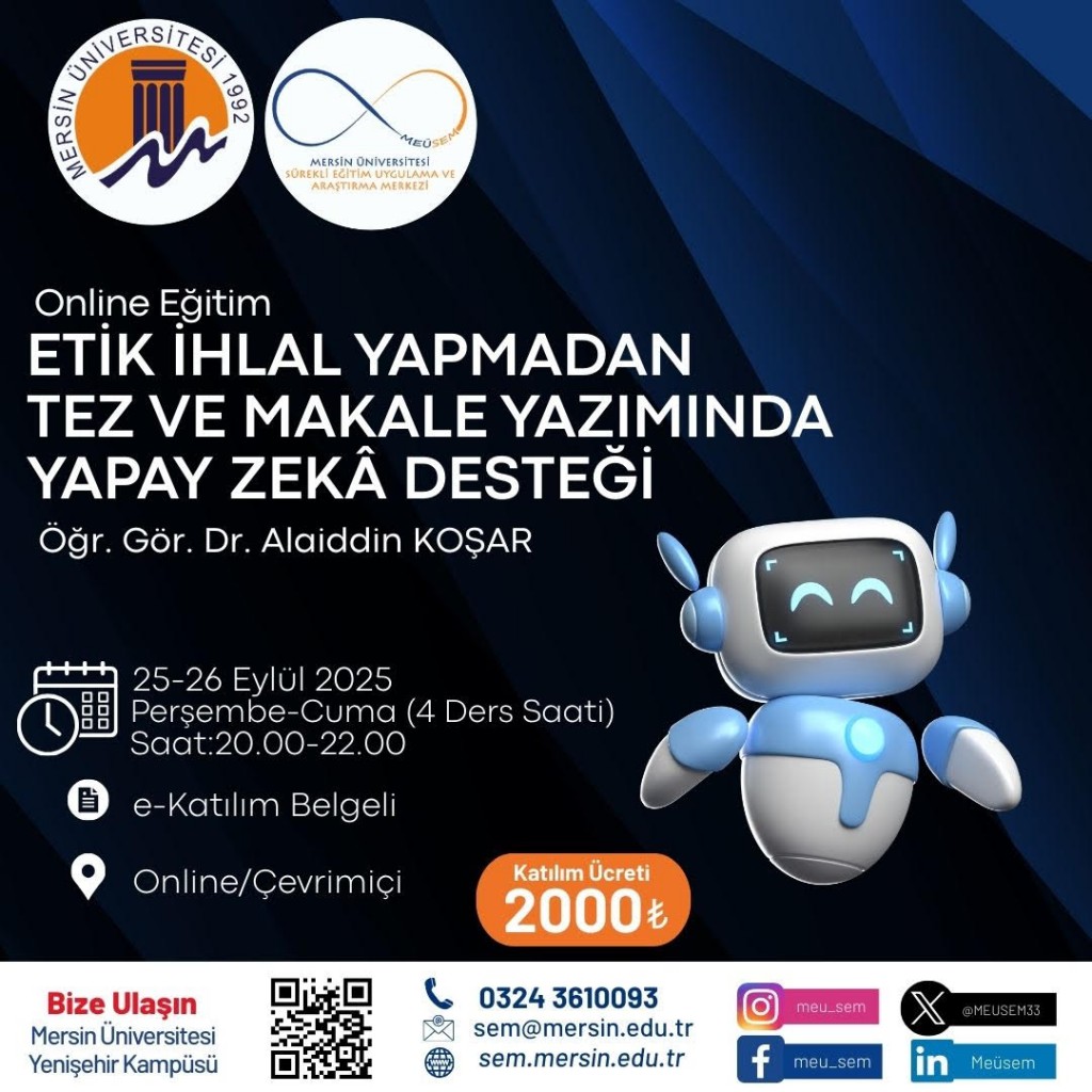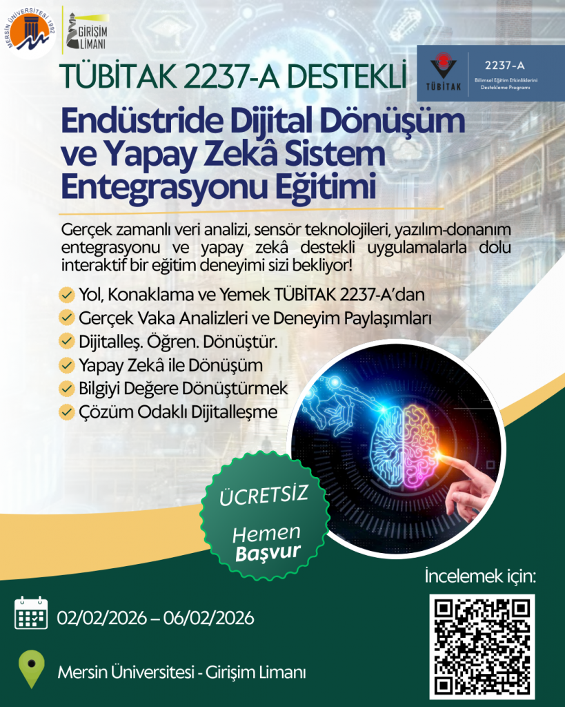 Mersin Üniversitesi Genç Girişimci Uygulama ve Araştırma Merkezi (Girişim Limanı) tarafından 02–06 Şubat 2026 tarihleri arasında “Endüstride Dijital Dönüşüm ve Yapay Zekâ Sistem Entegrasyonu Eğitimi” düzenlenecektir.