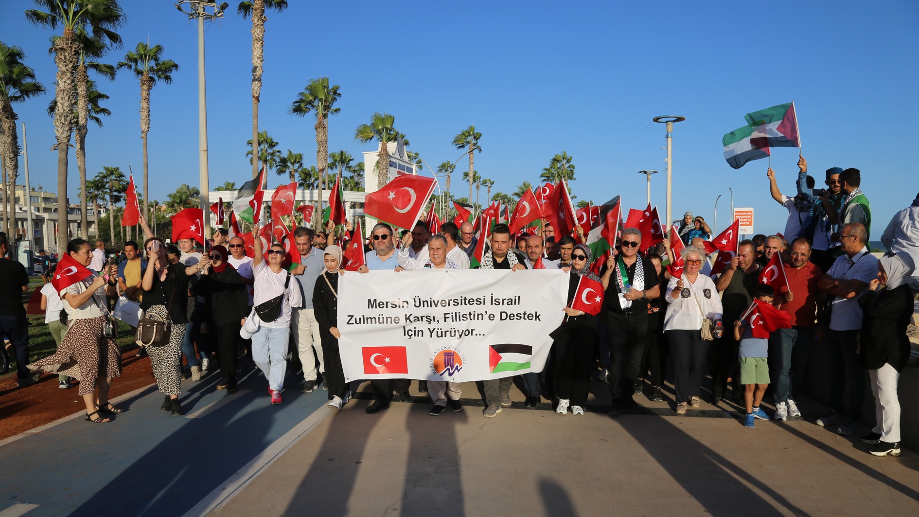 5 Ekim Pazar günü Mersin İdman Yurdu Meydanı’ndan başlayarak Özgecan Aslan Barış Meydanı’nda sona eren yürüyüşe, Rektörümüz Prof. Dr. Erol Yaşar öncülüğündeki akademik ve idari personelimiz ile öğrencilerimiz “Mersin Üniversitesi İsrail Zulmüne Karşı, Filistin’e Destek İçin Yürüyor” pankartını açarak yoğun bir katılım gösterdi.